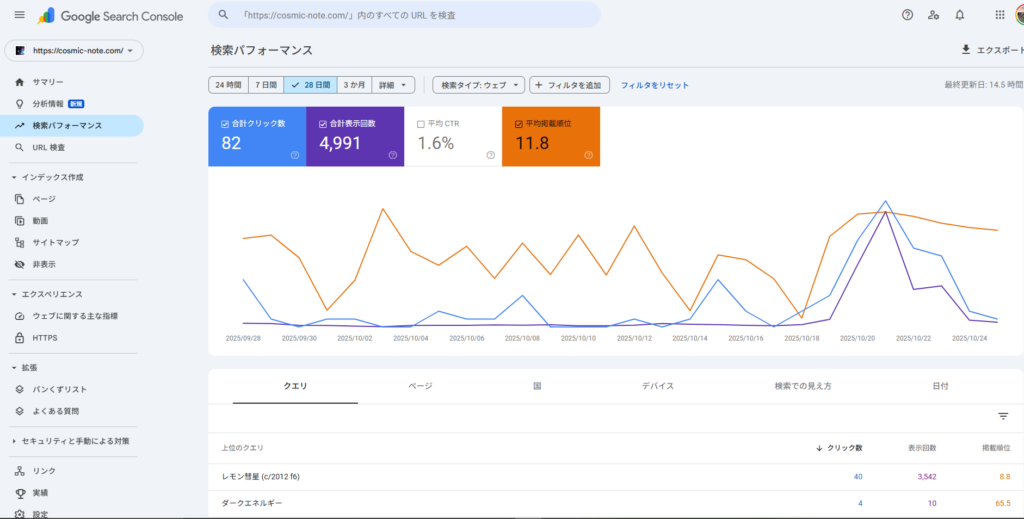 この私の仮説(専門性: Expertise)は、果たして正しかったのでしょうか? 2025年9月に立ち上げた『cosmic-note.com』の、10月(約1ヶ月後)のリアルなデータをご覧ください。