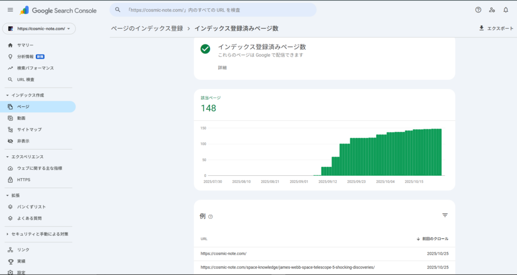 私が見たかったのは「魔法」ではなく、「兆候」です。 Googleがこの100記事を評価し、「このサイトは宇宙分野の専門サイトだ(=専門性・権威性)」と認識し始めているか、そのシグナルです。