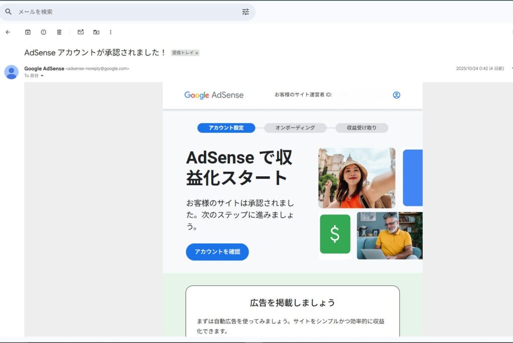 - AdSense一発合格:Googleの広告基準(=品質基準)をクリアし、即収益化が始まった。