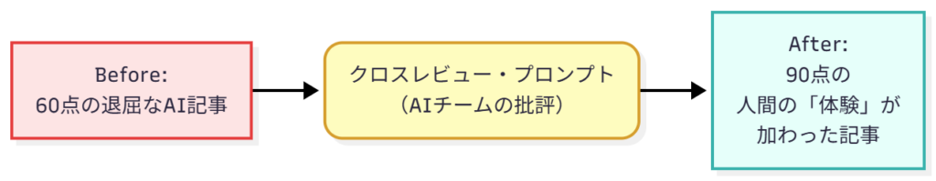 AI校Sチームのフィードバック(After)は、それ自体が「記事」ではありません。これは、AIの「同調バイアス」を壊して引き出した、高品質な「批評」に過ぎません。