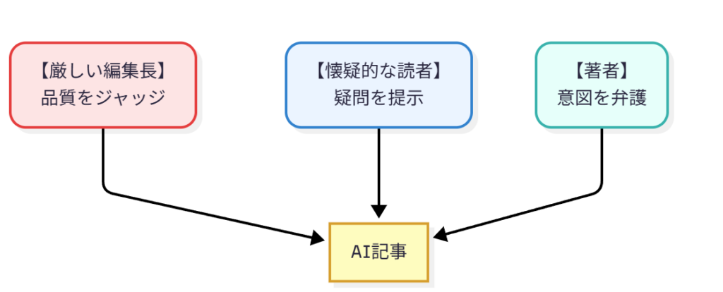 AIに「校S者」という単一のペルソナを与えるのではなく、「著者」「読者」「編集長」という、目的も視点も異なる3つのペルソナを割り当て、仮想の「編集会議」を強制的に開催させるのです。