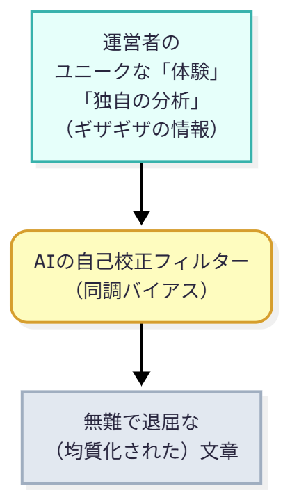 あなたの記事が持つ「鋭い指摘」や「あえて主流とは異なる見解」も、AI校正(自己同調)によって丸め込まれ、「一般的で無難な専門性」へと劣化します。どのブログも同じAIを使えば、同じ「正解」ばかりが並ぶのは当然です。