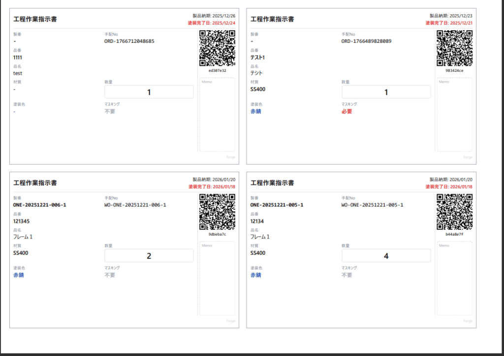 システムから印刷される作業指示書には、大きなQRコードが印字されています。