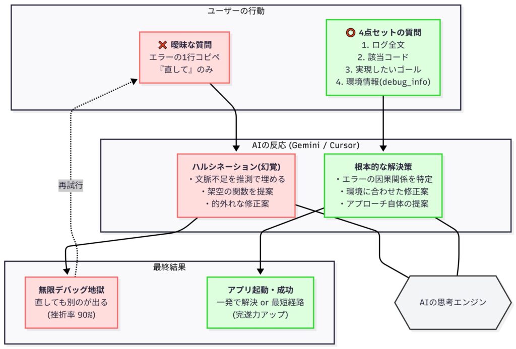 もしあなたがこれをやっているなら、今すぐキーボードから手を離して深呼吸しましょう。それは、お腹が痛いと訴えながら、医者に「どこが痛いのか」「いつから痛いのか」「昨日何を食べたのか」を一切話さず、ただ受付で「治してくれ!」と叫んでいるのと同じです。