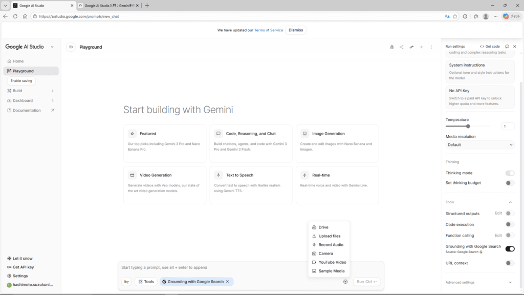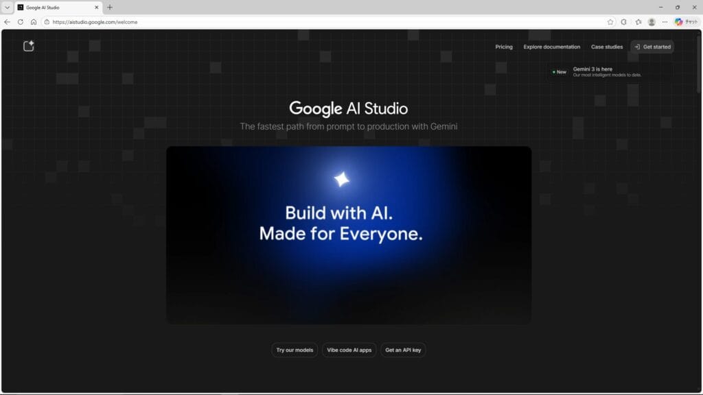 画面が開くと、少々無愛想な英語のインターフェースが表示されるはずです。「Welcome to Google AI Studio」という文字が見えたら、そこが目的地です。