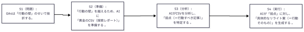 - S2(準備): 「行動の壁」を越えるため、AIに「黄金のCSV(探索レポート)」を準備する 。