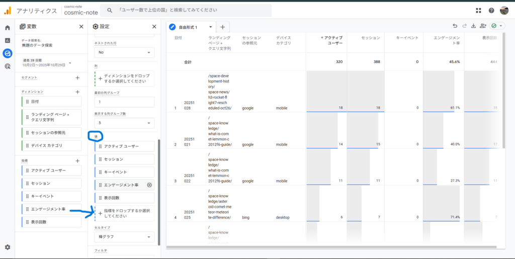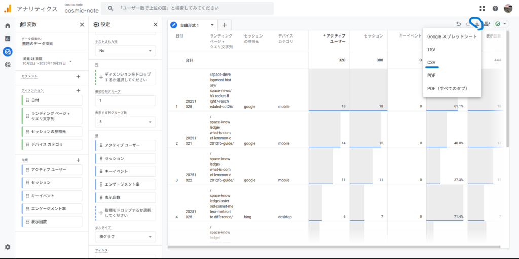 日付ごと、記事ごと、参照元ごとに、先ほど設定した指標(数値)が一覧になっているはずです。これがAIに読み込ませるデータの「完成形」です。