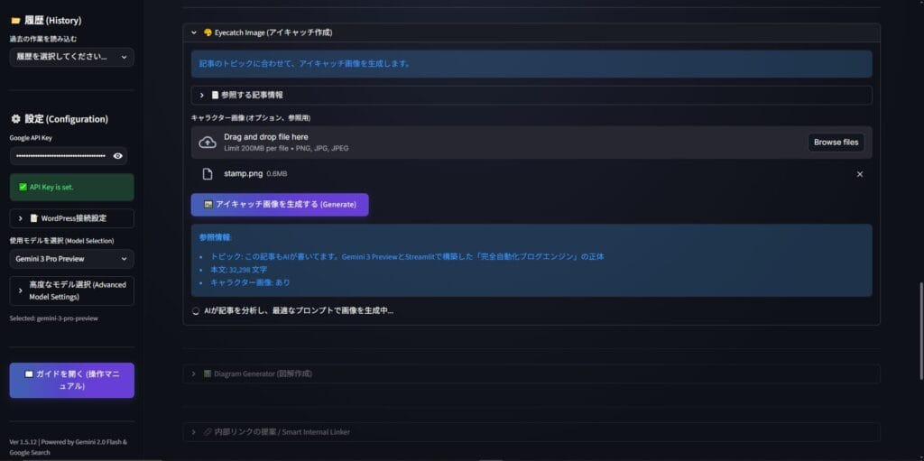 - 画像・DOM生成: 記事の内容にマッチした図解を生成し、WordPressへREST API経由で、HTMLタグ、alt属性、パーマリンク設定まで含めてPOSTする。