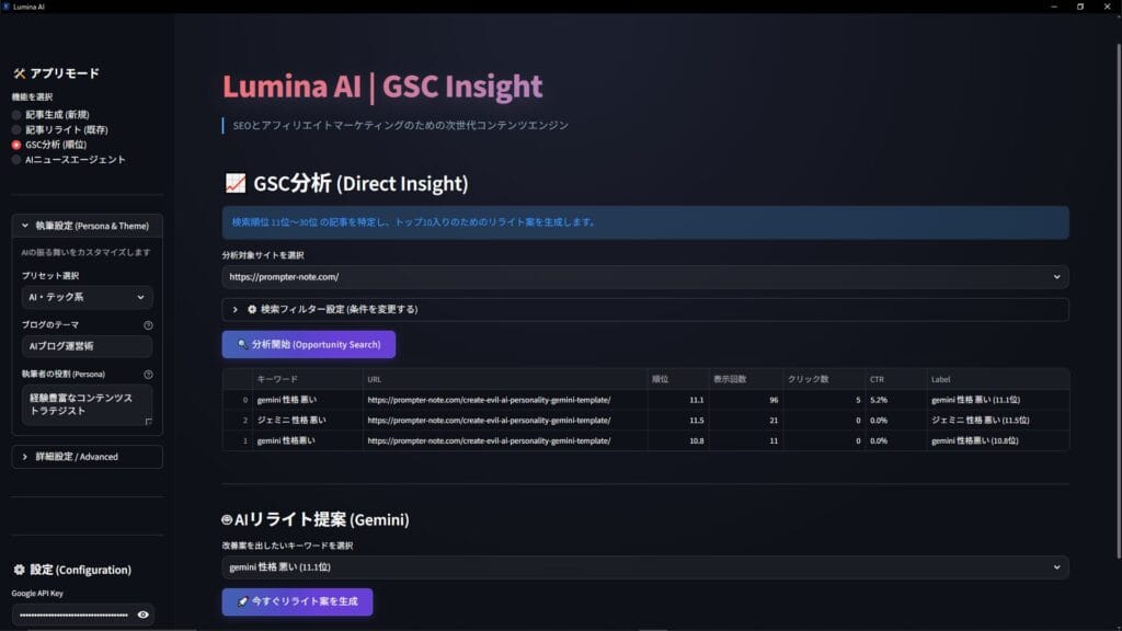 人間の勘によるキーワード選定では、このマイクロインテントに気づくことは不可能です。GSC APIの一次情報と、私の推論能力が融合して初めて、競合が手を出せない「圧倒的に専門性が高く、かつユーザーが今まさに求めているコンテンツ」を生み出すことができるのです。