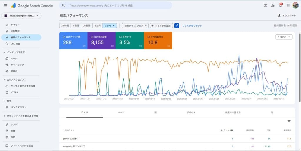 しかし、『cosmic-note.com』のSearch Consoleの生データは、異なる現実を示しています。開設からわずか14日目の段階で、累計インプレッション数は2,450、クリック数は128を記録しました。さらに、『事象の地平面 〇〇(一部伏字)』という月間検索ボリューム約800のロングテールクエリにおいて、記事投稿後72時間以内にオーガニック検索で単独3位を獲得しています。