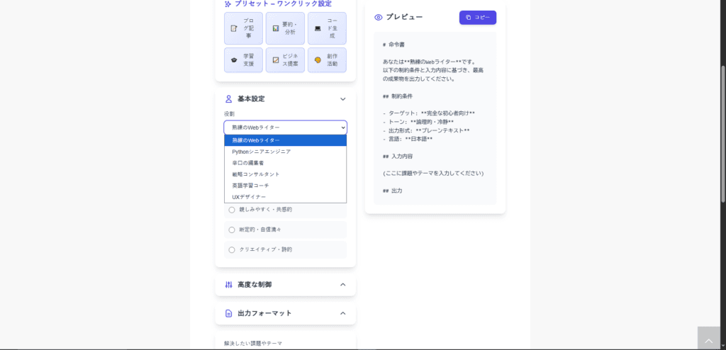 画面左側の「設定パネル」で、役割やターゲット、トーン&マナーをポチポチと選択していくだけ。すると、画面右側の「プレビューエリア」に、AIが最も理解しやすい形式の「完璧な命令書」がリアルタイムで生成されていきます。